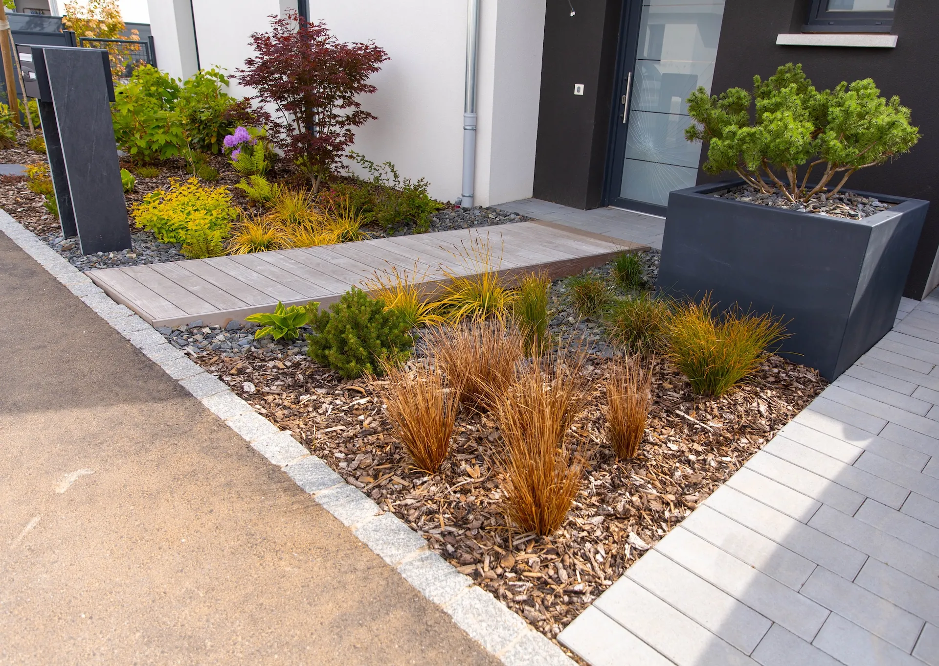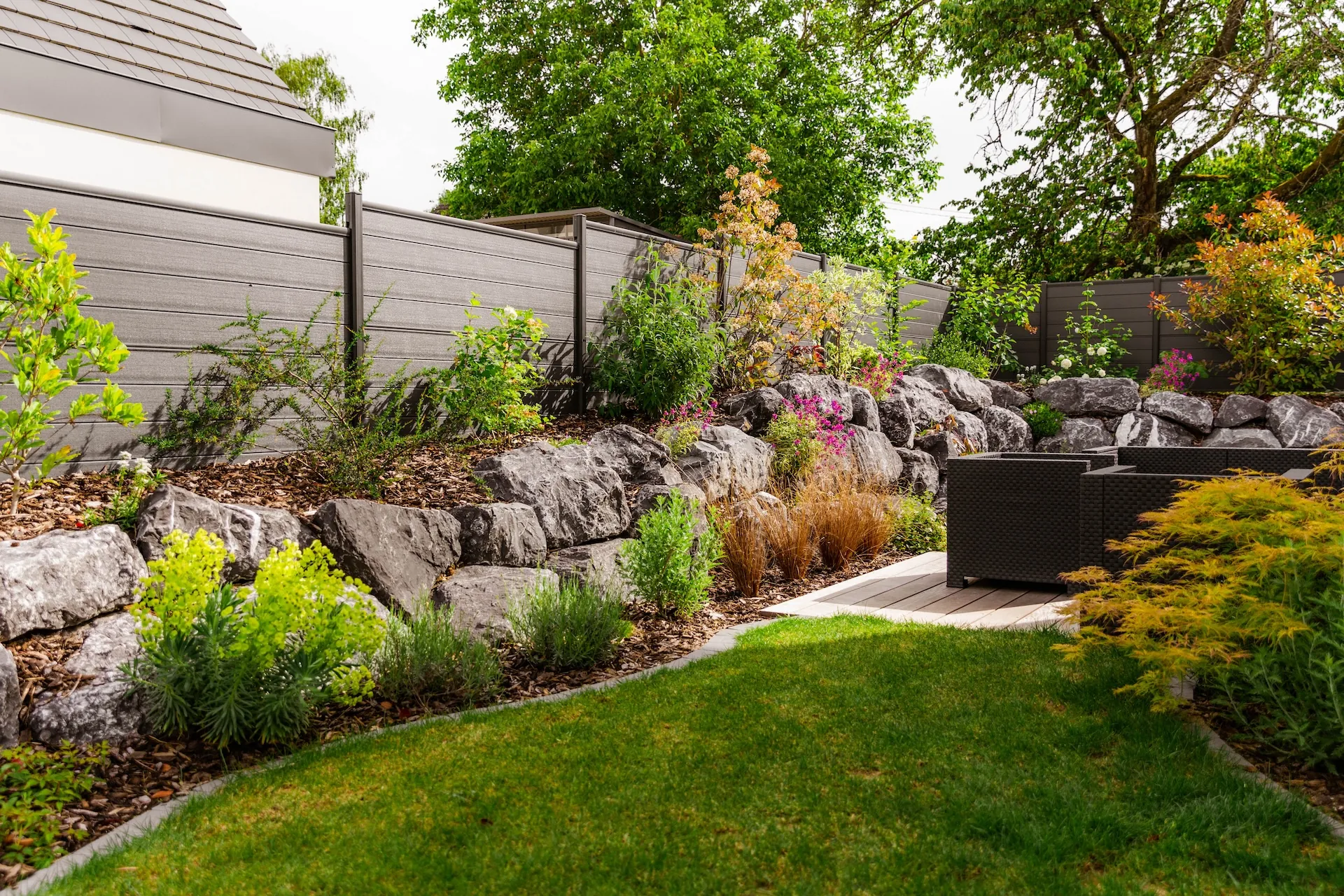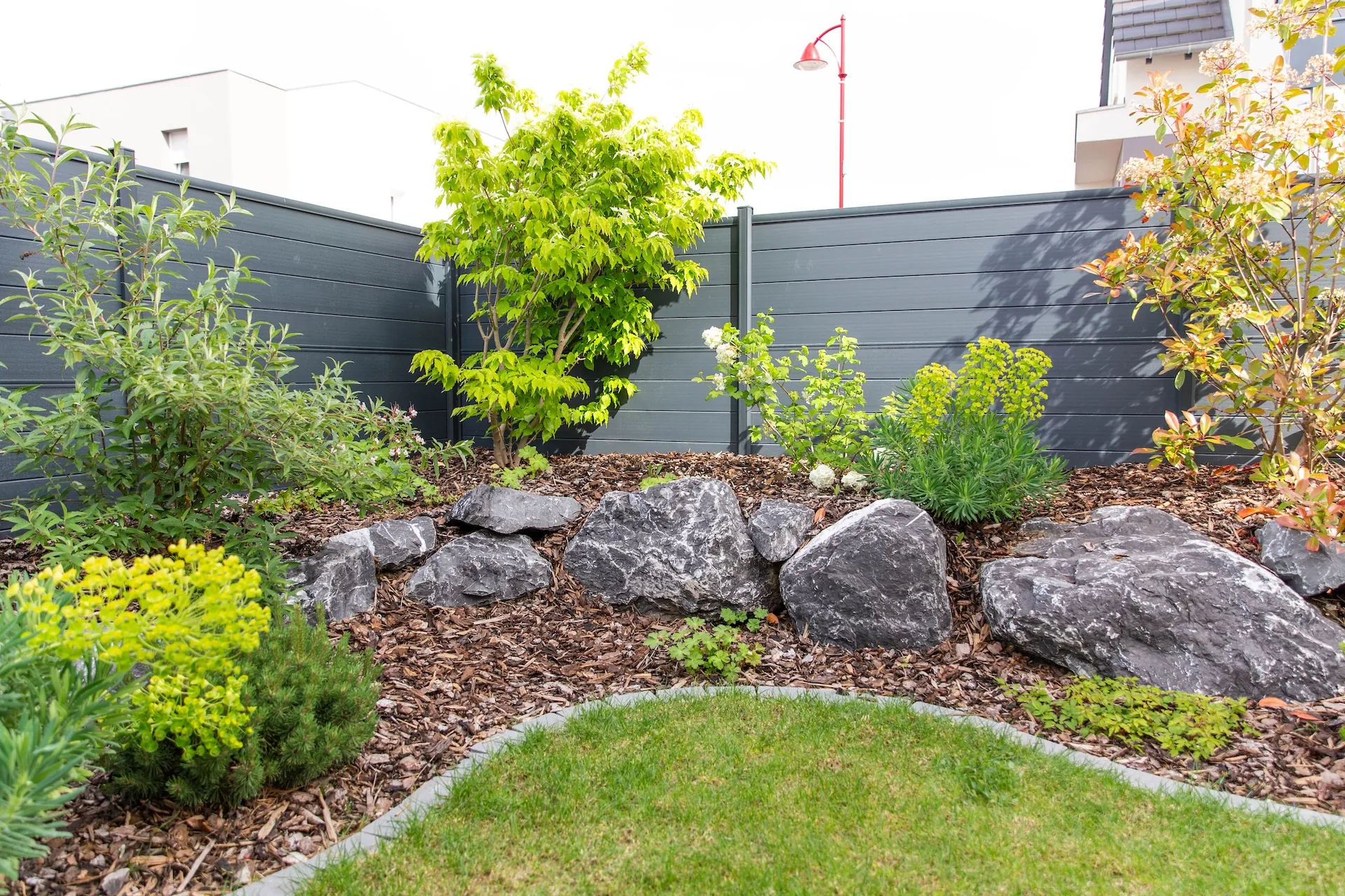 Aménagement d’une entrée paysagère - Terrassement pour la création du bassin sec, avec intégration d’un platelage bois et de plaques de schiste pour la boite aux lettres - Réalisation d’une clôture en claustra composite - Création d’une terrasse en dalles avec enrochement en pourtour des massifs