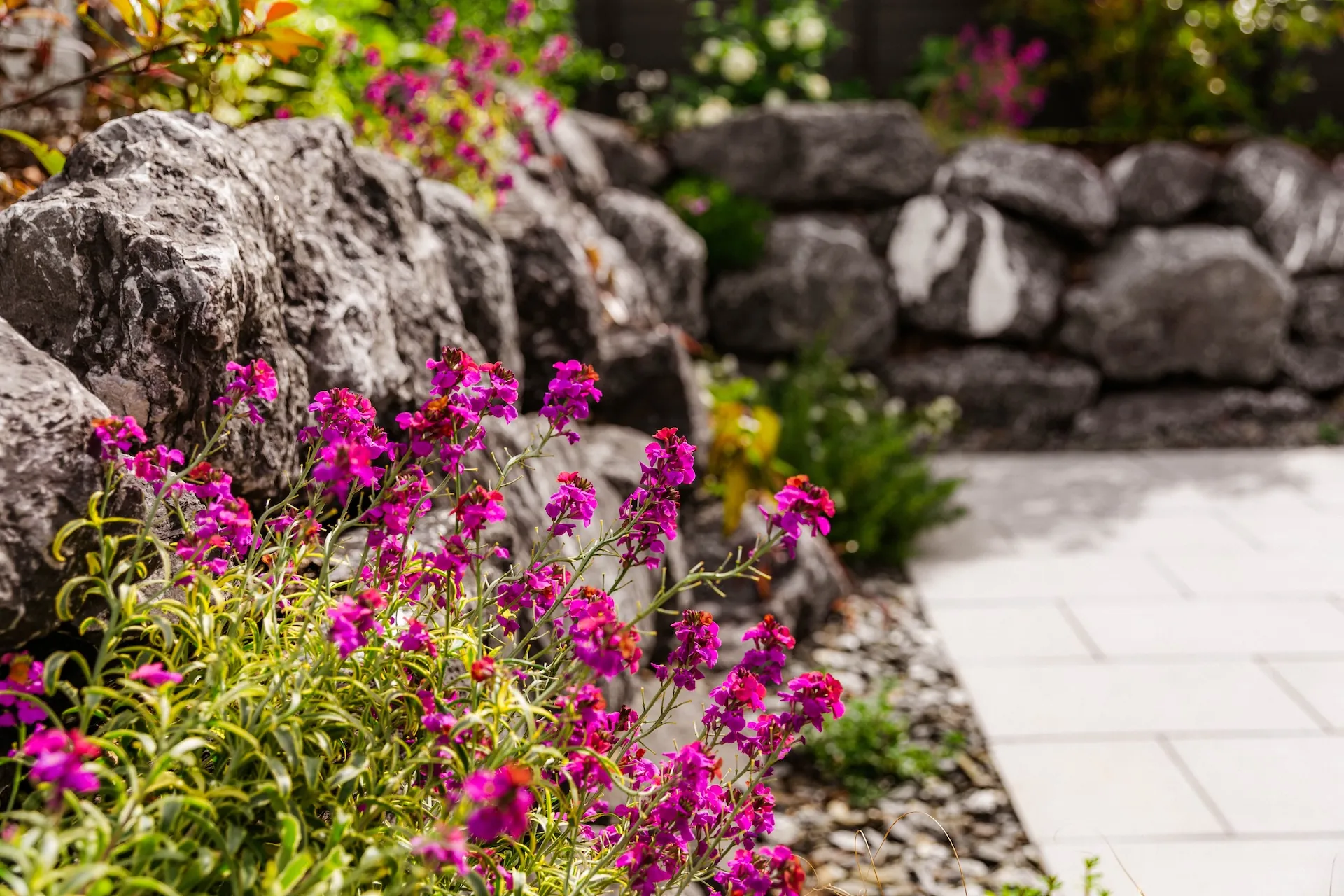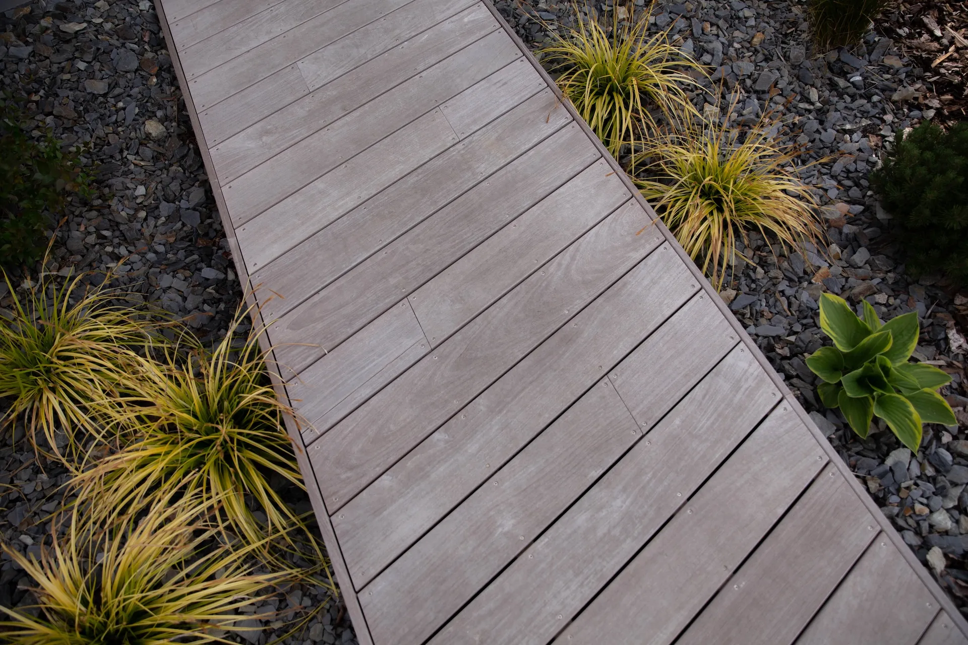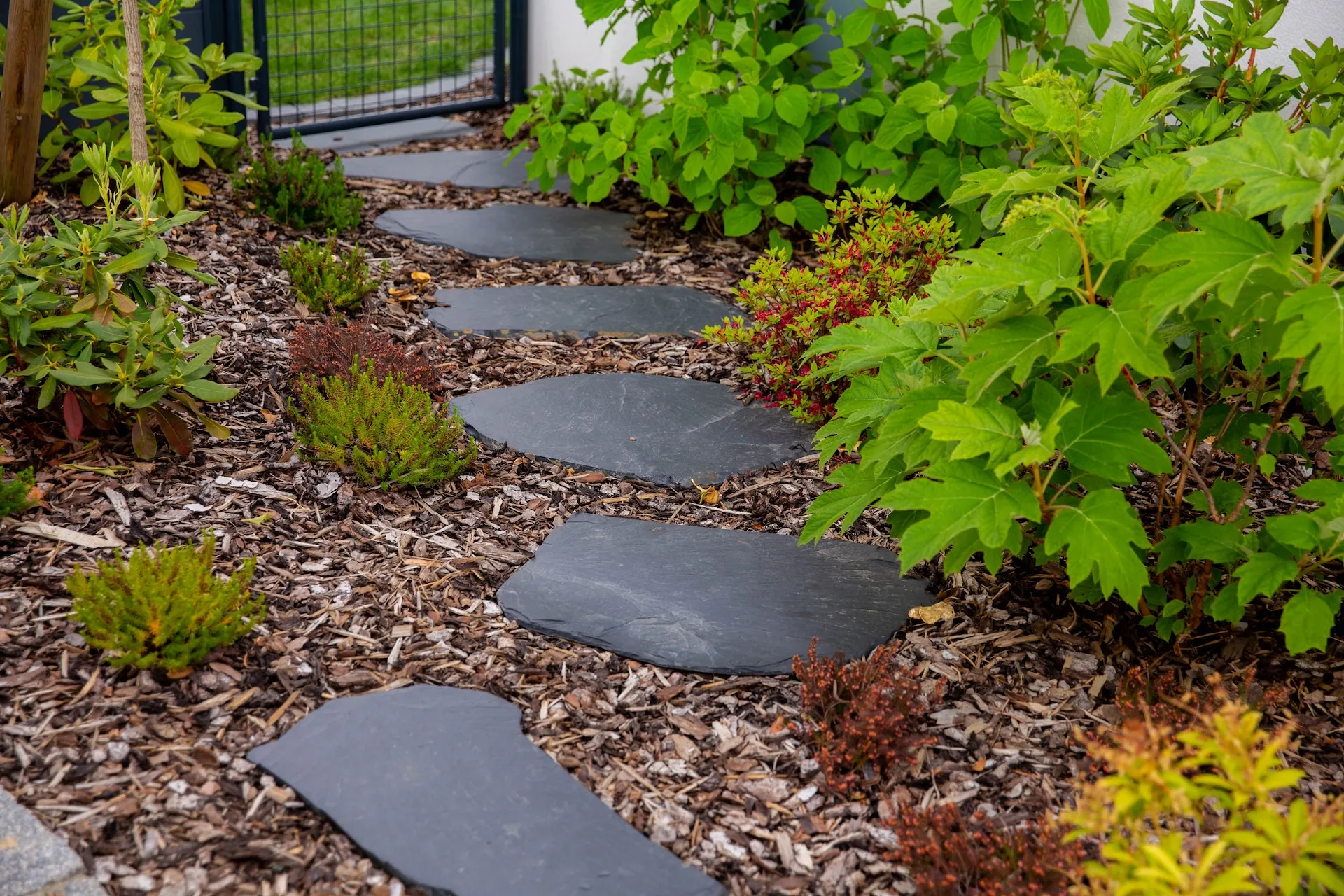 Aménagement d’une entrée paysagère - Terrassement pour la création du bassin sec, avec intégration d’un platelage bois et de plaques de schiste pour la boite aux lettres - Réalisation d’une clôture en claustra composite - Création d’une terrasse en dalles avec enrochement en pourtour des massifs
