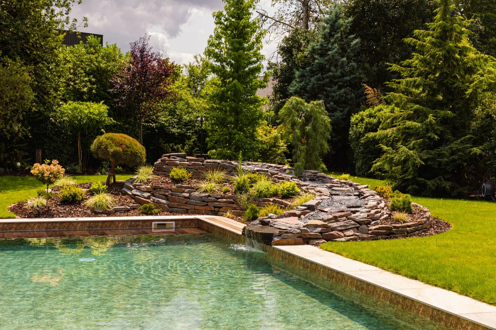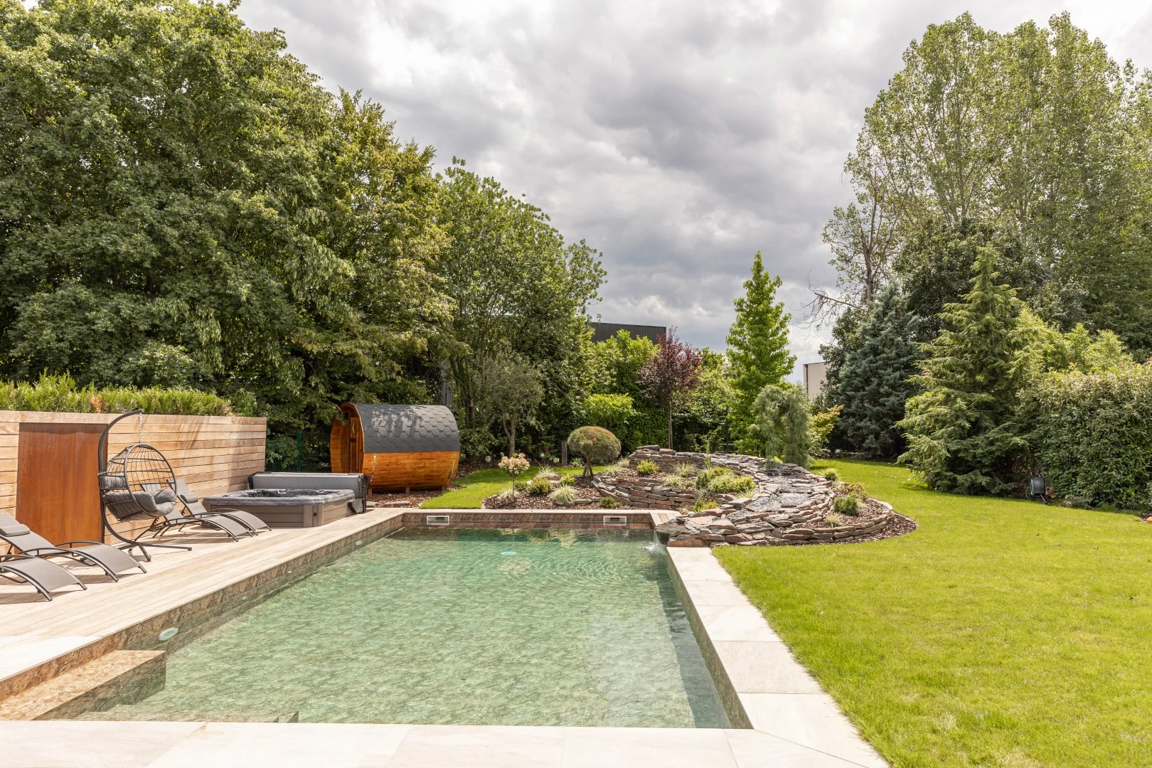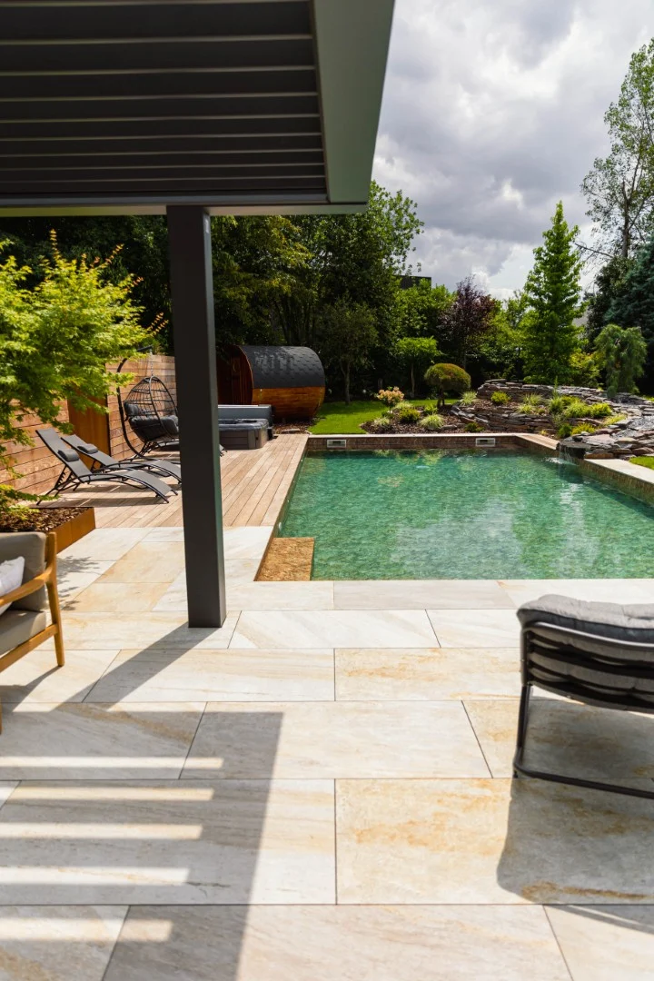 Rénovation d’une piscine et de ses abords - Rénovation du liner avec remplacement par un liner armé 3D touch, déplacement du local technique, démontage et remontage du volet immergé de la piscine avec intégration d’un système d’ouverture et fermeture par bluetooth, y compris création d’un escalier carréo sur mesure avec 3 marches - La réalisation d’un espace détente avec intégration d’un spa 471 et d’un sauna barrique - L’installation d’un éclairage extérieur comprenant des spots à piquets, des spots encastrés, des spots leds, des lampadaires, un éclairage de la cascade, et tout un système domotique - La mise en œuvre d’une colonne de douche thermostatique - La transformation de la piscine avec une filtration écologique et un électrolyseur de sel